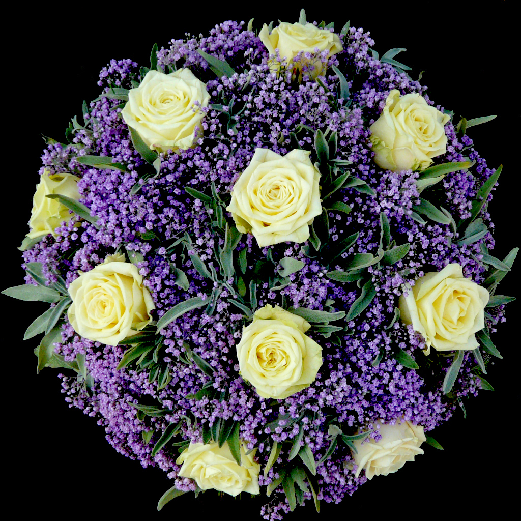 Tombstone arrangement, round shaped, made in Oasis base with water reserve. It is made of buttery white roses and baby’s breath in the shade of milka and sage.